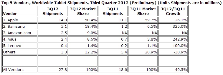 Il mercato degli smartphone è saldamente in mano al produttore sudcoreano Samsung, ma nel settore tablet è Apple a farla da padrona. Stando agli ultimi dati riportati da IDC facenti riferimento al terzo trimestre del 2012, il mercato dei tablet appare in forte crescita: un incremento delle spedizioni del 6.7% rispetto al Q2 2012 e del 49.5% rispetto allo scorso anno.